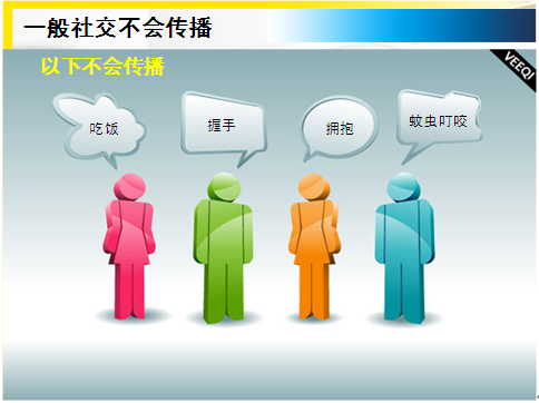拥抱、同桌吃饭、一起工作或学习、握手、礼节性接吻、公用办公用具、咳嗽、打喷嚏、蚊虫叮咬、一同沐浴、共用游泳池、共用厕所
